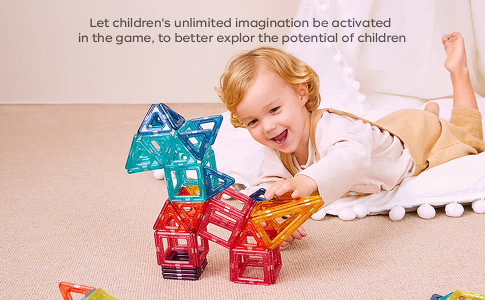 Colourful magnetic tiles contains 78pcs magnetic tiles of different shapes and 25 puzzle cards. Build their own magical fantacy straight away!